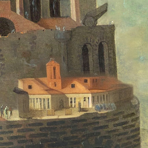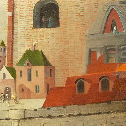 مشهد مزدحم: تصوّر هذه اللوحة المفعمة بالحيوية الأنشطة اليومية، حيث يقوم الناس بالبناء وبيع السلع والاستمتاع بتناول الطعام معًا.